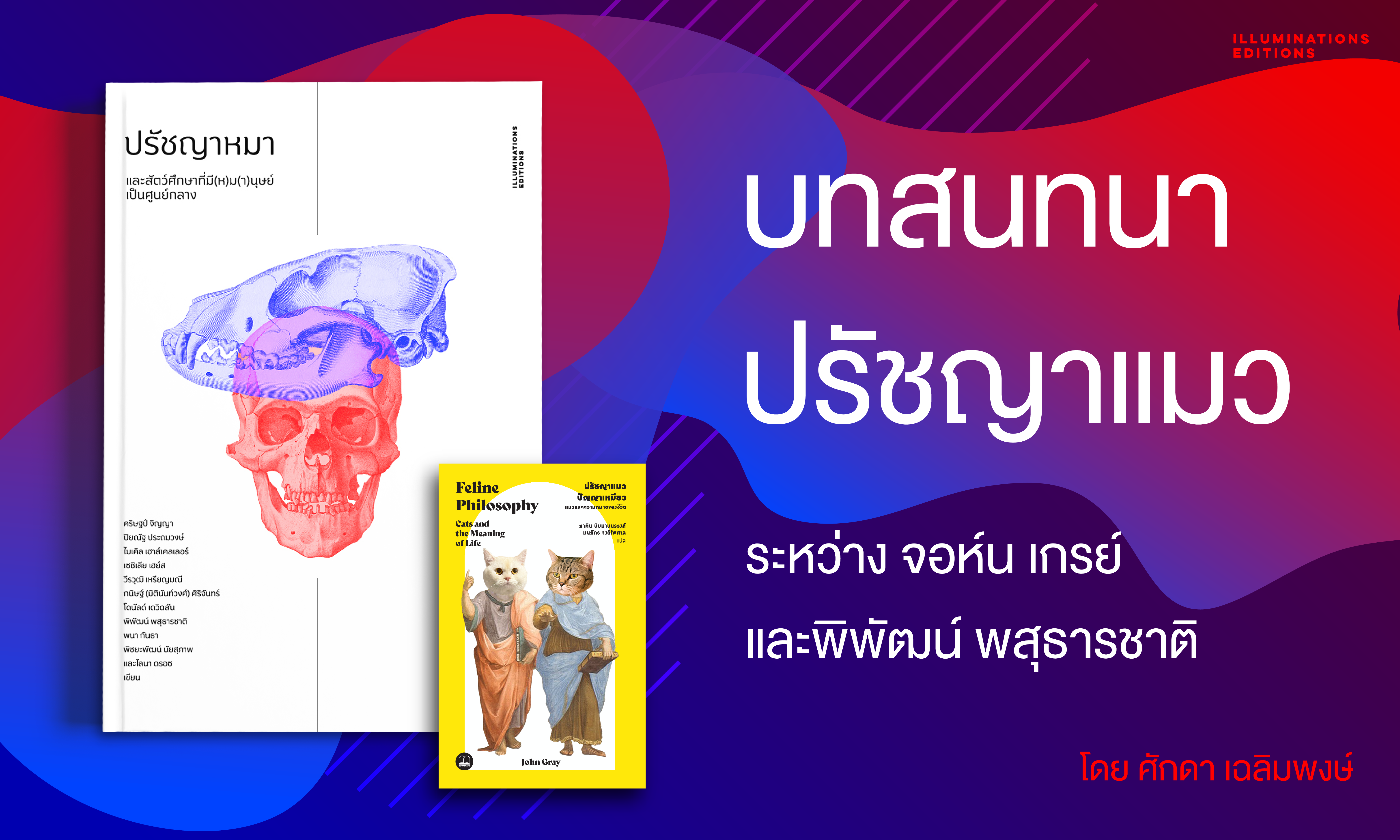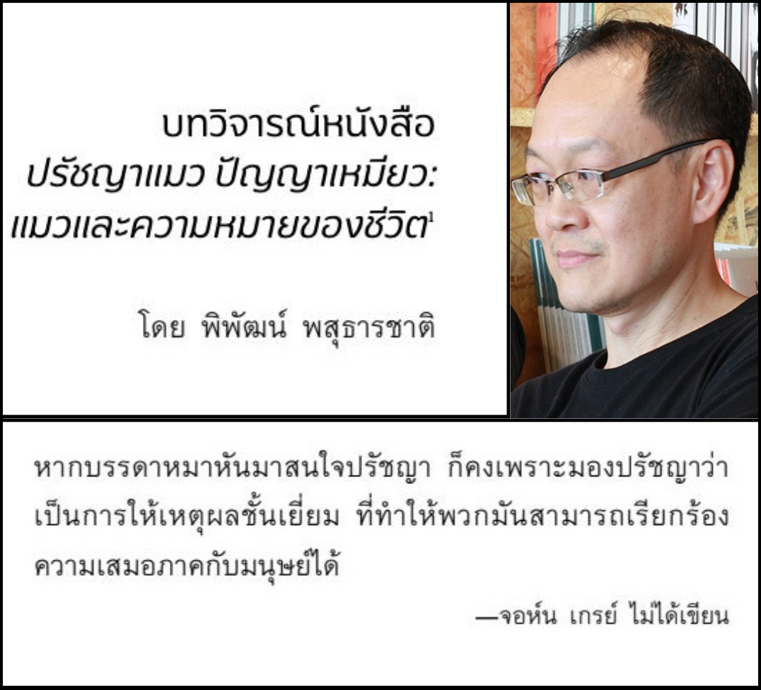 สุดท้ายนี้ หนังสือ 'ปรัชญาแมว ปัญญาเหมียว: แมวและความหมายของชีวิต' ของ จอห์น เกรย์ เป็นงานเขียนที่ผสมผสานเรื่องราวของแมวเข้ากับข้อเสนอทางปรัชญา โดยนำเสนอว่าแมวมีความสุขโดยพื้นฐานเมื่อปราศจากภัยคุกคาม และไม่ยึดติดกับความทุกข์หรือครุ่นคิดถึงความหมายของชีวิตแบบมนุษย์ อย่างไรก็ตาม บทวิจารณ์ของ พิพัฒน์ พสุธารชาติ ที่มีต่อปรัชญาแมวชี้ให้เห็นข้อบกพร่องในตรรกะของจอห์น เกรย์ ผู้เขียนเห็นด้วยในหลายประเด็นของพิพัฒน์ โดยเฉพาะเรื่องจุดกำเนิดของปรัชญาที่ควรมาจากความแปลกใจมากกว่าความวิตกกังวล แต่ก็พยายามทำความเข้าใจมุมมองของเกรย์ด้วยเช่นเดียวกัน ว่าทำไมถึงเลือกใช้ธรรมชาติของแมวมาเป็นต้นแบบทางศีลธรรมให้มนุษย์ได้เรียนรู้จากแมว หนังสือปรัชญาแมวจึงเป็นทั้งหนังสือที่อ่านสนุกและน่าชวนถกเถียง ในขณะที่การวิพากษ์ของพิพัฒน์นี้ได้โต้แย้งได้อย่างมีเหตุผลหนักแน่น และสะท้อนถึงคุณค่าของการอ่านเชิงวิจารณ์ ซึ่งเป็นหัวสำคัญของการทำกิจกรรมทางปรัชญา