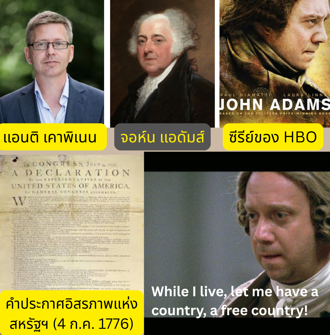 รูปที่ 4. ทฤษฎีความหมายของชีวิตของแอนติ เคาพิเนน โดยใช้ตัวอย่าง ‘เรื่องเล่า’ ของจอห์น แอดัมส์-ประธานาธิบดีคนที่ 2 ของสหรัฐฯ; จะเห็นว่าเรื่องเล่าของแอดัมส์ แสดงให้เห็นว่าเขามีชีวิตที่มีความหมาย โดยได้รับการยกย่องให้เป็นหนึ่งในกลุ่มบิดาผู้ก่อตั้งประเทศสหรัฐอเมริกา (หมายเหตุ: John Adams (2008) เป็นมินิซีรีย์ซึ่งพอล จิอาแมตติ รับบทเป็นจอห์น แอดัมส์)