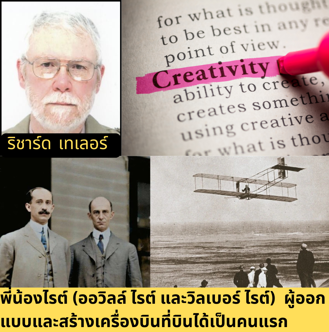 รูปที่ 5. ทฤษฎีความหมายของชีวิตของริชาร์ด เทเลอร์ โดยใช้ตัวอย่างของพี่น้องไรต์ ผู้ออกแบบและสร้างเครื่องบินที่บินได้จริงๆ เป็นคนแรก ; งานของพวกเขาเป็นพื้นฐานสำคัญให้กับคนอื่น ๆ ในการประดิษฐ์เครื่องบินที่มีประสิทธิภาพในการบินที่ดีขึ้น บินได้นานขึ้น เร็วขึ้น และปลอดภัยขึ้นเรื่อย ๆ จนกลายมาเป็นเครื่องบินที่เราเห็นในปัจจุบัน