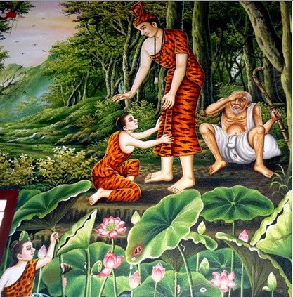มหาทาน ภาพจิตรกรรมฝาผนังที่วัดภูเก็ต อำเภอปัว จังหวัดน่าน เป็นฉากสระบัวของเวสสันดรชาดก