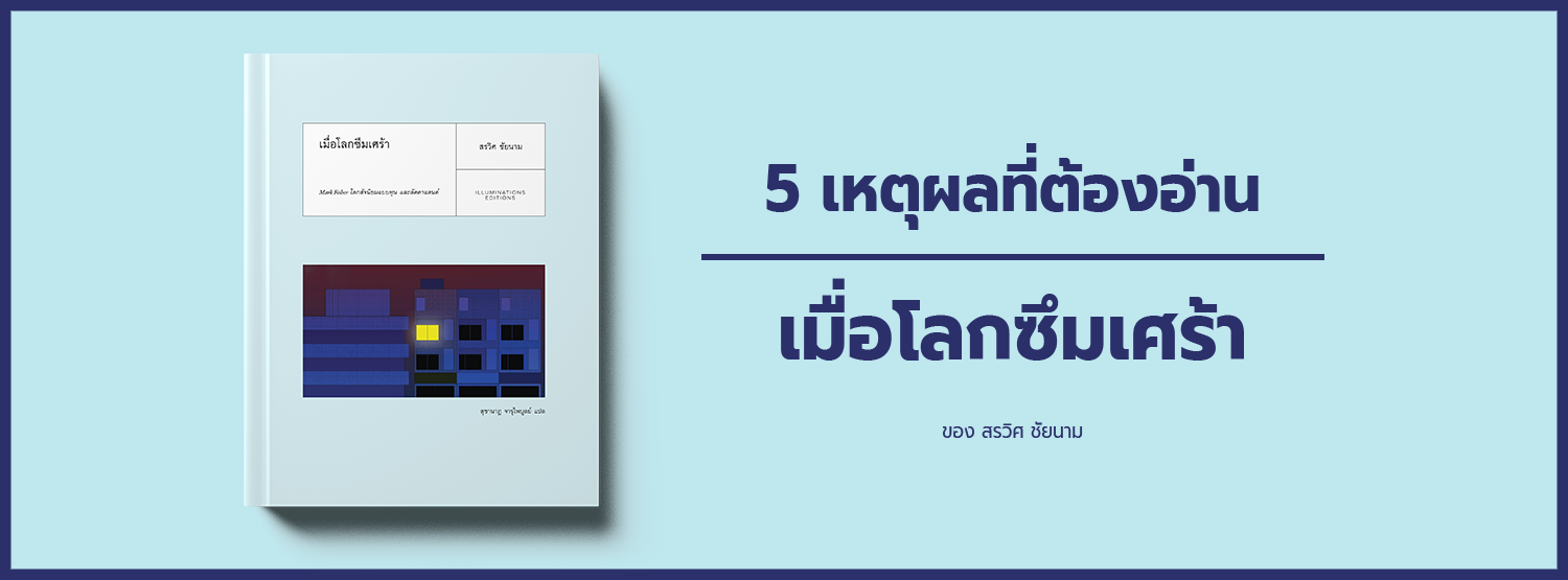 เราอยู่ในยุคสมัยที่คนเดินเข้าโรงพยาบาลเพราะโรคซึมเศร้าเป็นว่าเล่น คนจำนวนมากฝืนทนทำงานที่ตัวเองไม่ชอบ ความเหลื่อมล้ำกำลังมากขึ้นเรื่อยๆ แต่ไม่มีใครอยากจะสนใจมัน สิ่งเหล่านี้เกิดขึ้นได้อย่างไร บางทีหนังสือ "เมื่อโลกซึมเศร้า" ของสรวิศ ชัยนาม อาจจะช่วยตอบคุณได้บ้าง และนี่คือเหตุผลว่าทำไมคุณต้องอ่านหนังสือเล่มนี้