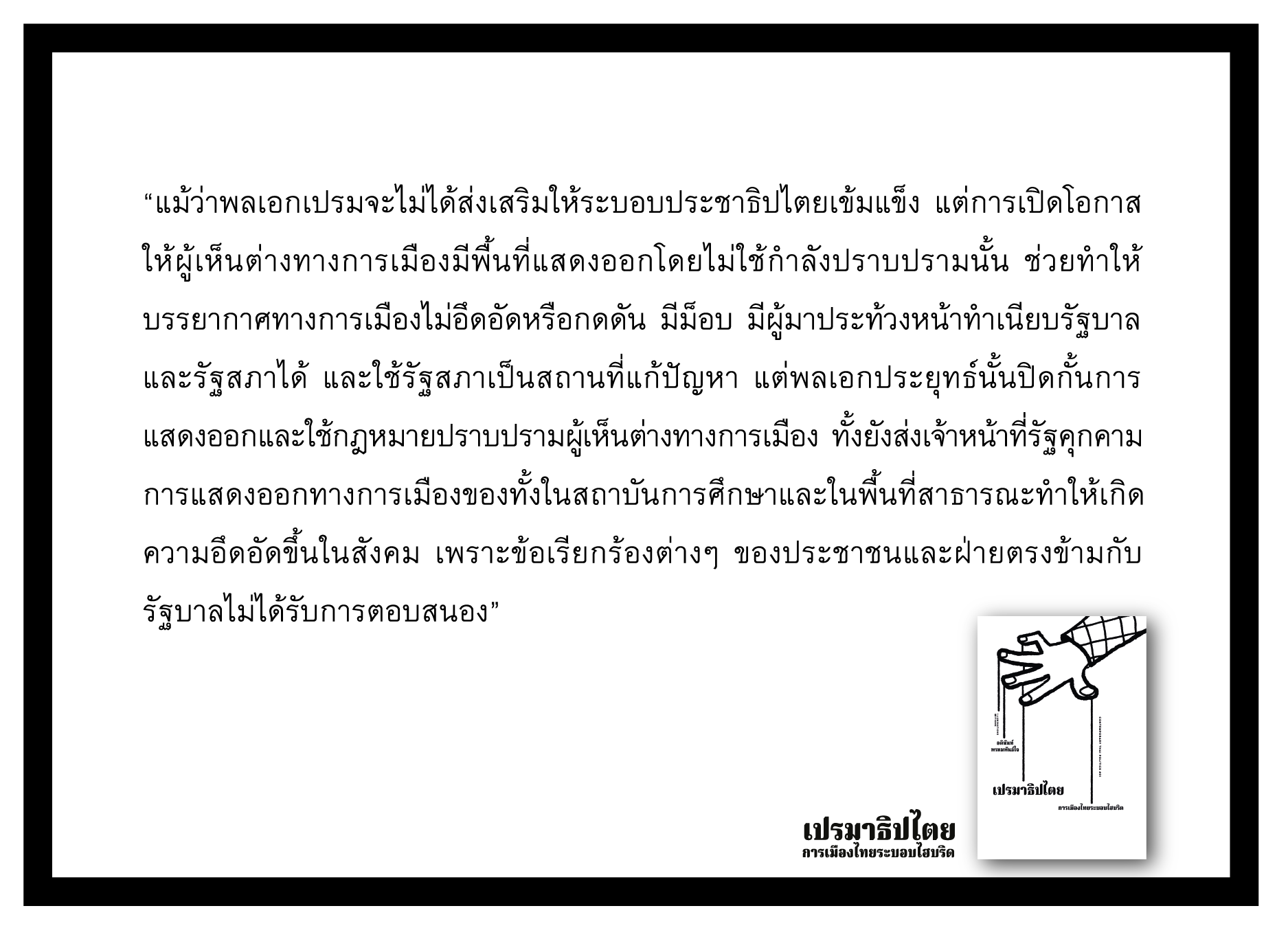 แม้ว่าพลเอกเปรมจะไม่ได้ส่งเสริมให้ระบอบประชาธิปไตยเข้มแข็ง แต่การเปิดโอกาสให้ผู้เห็นต่างทางการเมืองมีพื้นที่แสดงออกโดยไม่ใช้กำลังปราบปรามนั้น ช่วยทำให้บรรยากาศทางการเมืองไม่อึดอัดหรือกดดัน มีม็อบ มีผู้มาประท้วงหน้าทำเนียบรัฐบาลและรัฐสภาได้ และใช้รัฐสภาเป็นสถานที่แก้ปัญหา แต่พลเอกประยุทธ์นั้นปิดกั้นการแสดงออกและใช้กฎหมายปราบปรามผู้เห็นต่างทางการเมือง ทั้งยังส่งเจ้าหน้าที่รัฐคุกคามการแสดงออกทางการเมืองของทั้งในสถาบันการศึกษาและในพื้นที่สาธารณะทำให้เกิดความอึดอัดขึ้นในสังคม เพราะข้อเรียกร้องต่างๆ ของประชาชนและฝ่ายตรงข้ามกับรัฐบาลไม่ได้รับการตอบสนอง