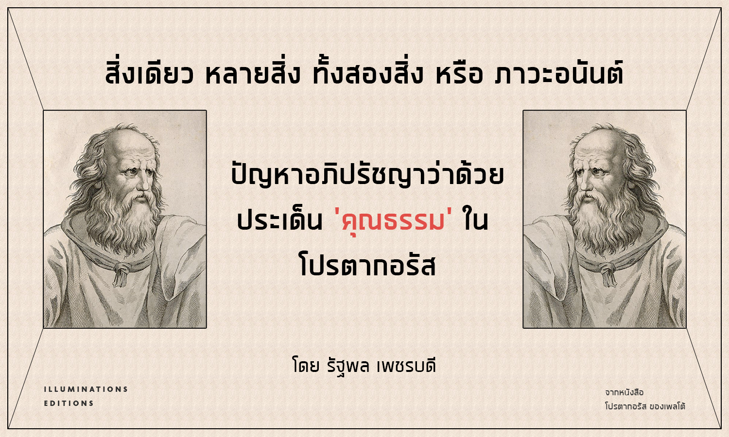 ผู้เขียนขอเริ่มต้นอย่างนี้ เราเพิ่งพูดกันไปในตอนที่แล้วว่าคุณธรรมในมุมมองของโสกราตีสนั้นเป็นหนึ่งเดียวกัน ทั้งหมดต่างกันก็เพียงแค่ชื่อ แต่แก่นสารและคุณสมบัติของทั้งหมดนั้นล้วนไม่ต่างกัน ซึ่งสำหรับโสกราตีสนั้นคุณธรรมคือความรู้ เราจึงสามารถนึกภาพตามได้ง่าย ๆ ว่าขอเพียงแค่เรามีความรู้ (อย่างแท้จริง) คุณธรรมต่าง ๆ (ถ้าพูดถึงเฉพาะเจาะจงใน โปรตากอรัส ก็คือ ความมีปัญญา, ความรู้จักพอดี, ความกล้าหาญ, ความชอบธรรม และ ความเคารพกฏของเทพ) ก็จะงอกเงยออกมาตามธรรมชาติเอง ซึ่งตรงนี้เอง ที่ผู้เขียนคิดว่าเราอาจต้องทำความเข้าใจสิ่งที่โสกราตีสพยายามยืนยันผ่านแว่นอภิปรัชญา เราจึงจะเข้าใจอย่างถ่องแท้ว่ากลไกความคิดที่ว่าคุณธรรมทั้งหลายเป็นสิ่งเดียวกันนั้นทำงานอย่างไร (และอาจมีปัญหาต่อไปหรือไม่อย่างไรในอนาคตด้วย)
