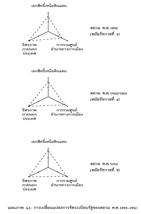 ก่อนอื่นผมอาจจะรีบโชว์จุดไคลแม๊กซ์ไปหน่อย แต่กระนั้นผมคิดว่าภาพที่ 4.1 (ภาพด้านล่าง) ของหนังสือเล่มนี้ ถือเป็นการสรุปกินความข้อเสนอหลักของชงในเรื่องรัฐสยาม/ไทยได้เป็นอย่างดี โดยชงเสนอว่าควรพิจารณาความเป็นรัฐอธิปไตย (sovereign statehood) จาก 3 เรื่องด้วยกัน ได้แก่ 1) การรวมศููนย์์อำนาจทางการเมืือง (political centralisation) 2) บููรณภาพแห่่งดิินแดน (territorial exclusivity) และ 3) อำนาจอิิสระในการดำเนิินกิิจการกัับภายนอก (external autonomy) เพื่อพิจารณาถึงความเปลี่ยนแปลงที่ค่อย ๆ ก่อตัวขึ้นของรัฐสยาม/ไทย และภาพที่ 4.1 นี้เองที่ช่วยสรุปภาพรวมพัฒนาการของการก่อตัวความเป็นรัฐอธิปไตยของสยาม/ไทยได้เป็นอย่างดี แต่ปัจจัยอะไรละที่เป็นจักรกลสำหรับของการขับเคลื่อนพัฒนาการนี้?