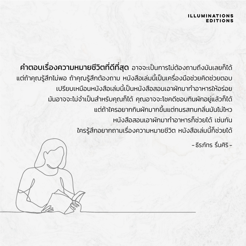 A5: อาจจะพอก็ได้นะครับ วูล์ฟก็ไม่ได้บอกว่าไม่พอ วูล์ฟยกวลีนี้มาด้วยซ้ำ คำตอบเรื่องความหมายชีวิตที่ดีที่สุดอาจจะเป็นการไม่ต้องถามถึงมันเลยก็ได้ แต่ถ้าคุณรู้สึกไม่พอ ถ้าคุณรู้สึกต้องถาม หนังสือเล่มนี้เป็นเครื่องมือช่วยคิดช่วยตอบ เปรียบเหมือนหนังสือเล่มนี้เป็นหนังสือสอนเอาผักมาทำอาหารให้อร่อย มันอาจจะไม่จำเป็นสำหรับคุณก็ได้ คุณอาจจะโชคดีชอบกินผักอยู่แล้วก็ได้ แต่ถ้าใครอยากกินผักมากขึ้นแต่ทนรสทนกลิ่นมันไม่ไหว หนังสือสอนเอาผักมาทำอาหารก็ช่วยได้ เช่นกัน ใครรู้สึกอยากถามเรื่องความหมายชีวิต หนังสือเล่มนี้ก็ช่วยได้